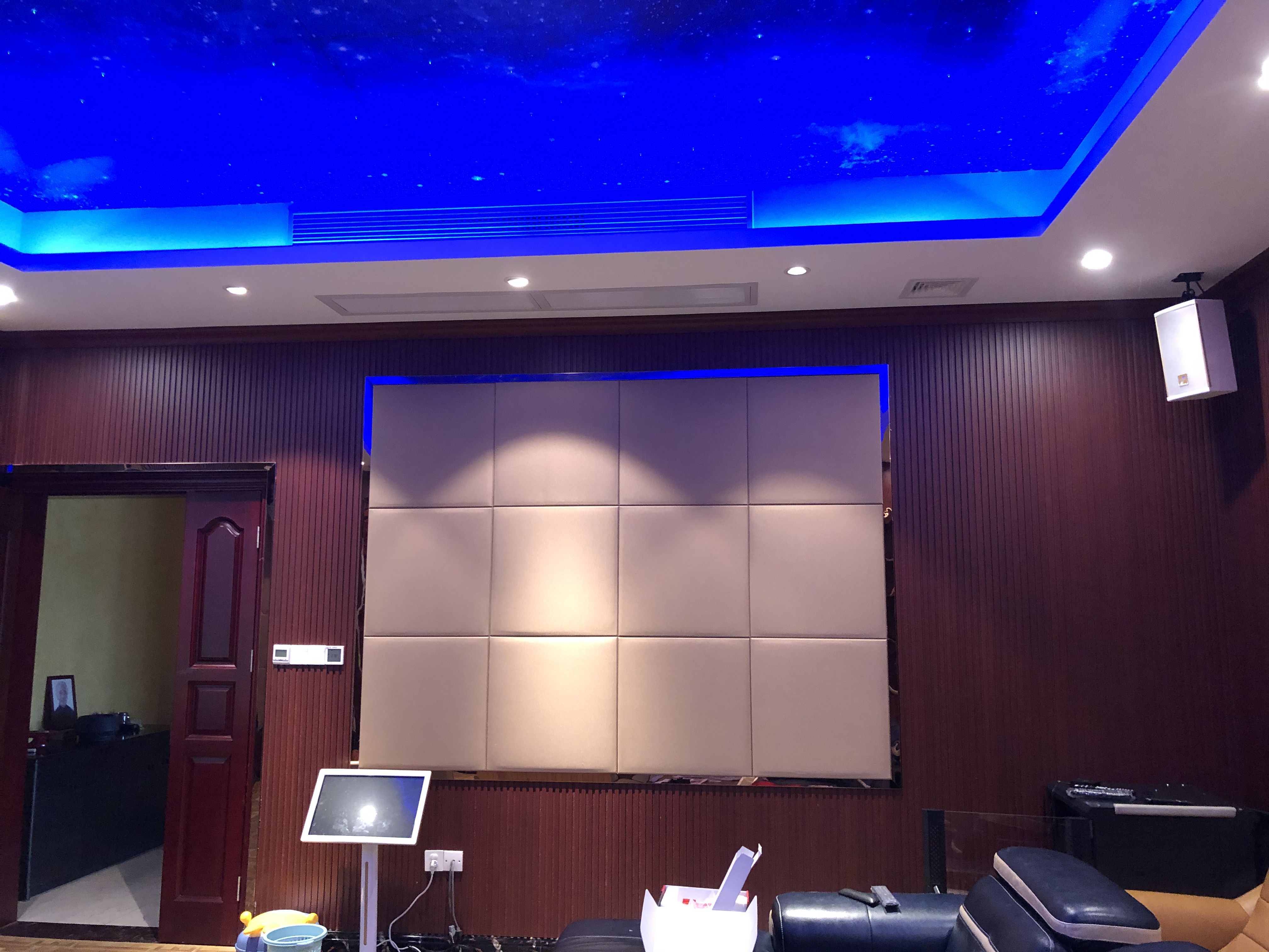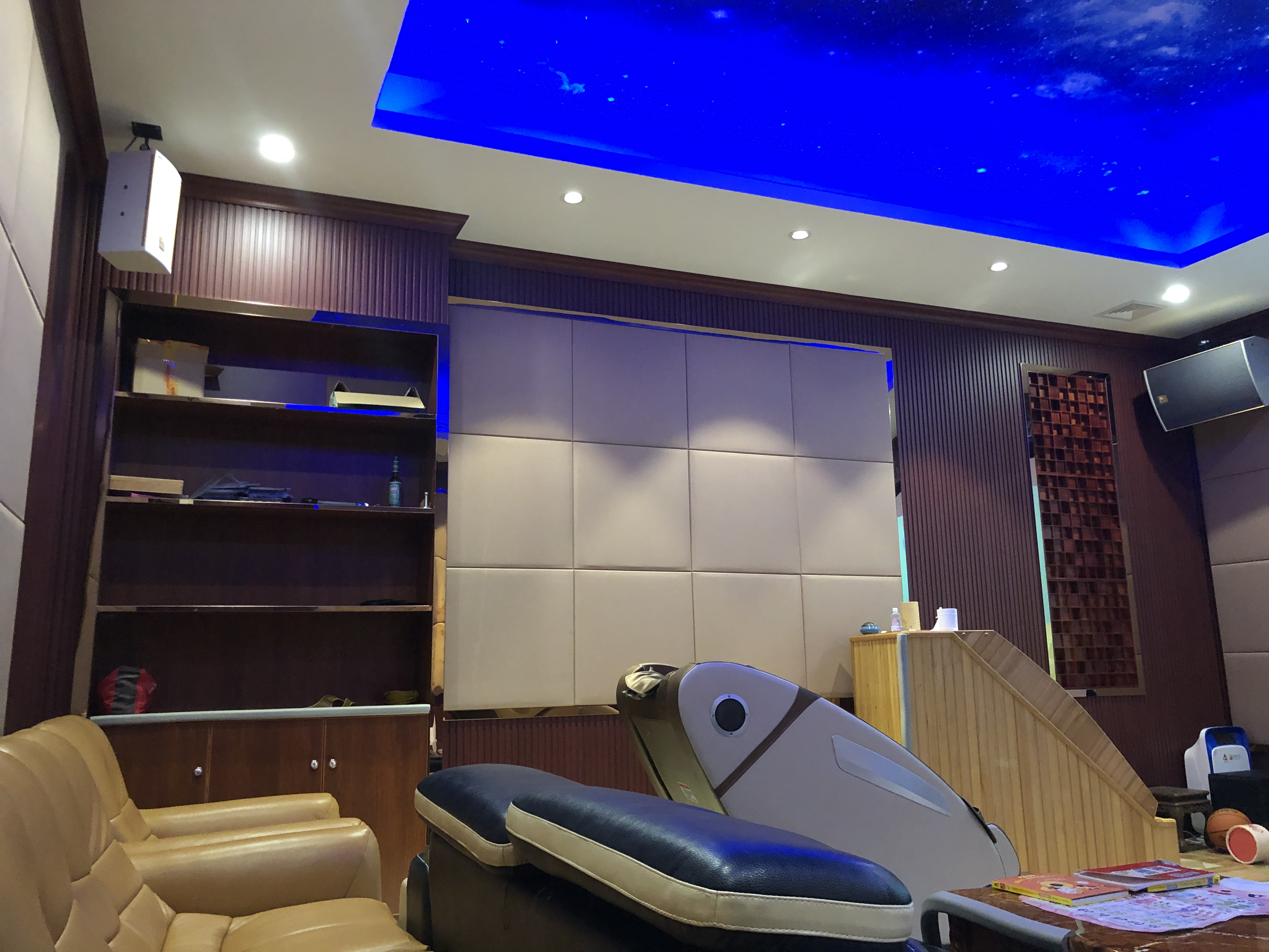 裝修施工內容:毛胚房裝修至娛樂(lè )室,四個(gè)墻面及天花造型及裝飾表面,油漆,整屋燈光,酒吧酒柜設計裝修,聲學(xué)材料、聲學(xué)處理建議等喜歡看電影聽(tīng)音樂(lè )的朋友們,誰(shuí)不想有一套自己的家庭影院?誰(shuí)不想獨自享受一個(gè)人的大影院?這樣的影音能夠帶給我們不一樣的家庭享受、溫馨變得更加的具體和生動(dòng)。蓮湖山莊的影音室設備采用的是杰士R-5502-W系列音箱、天龍AVR-X2400功放、愛(ài)普生CH-TW6300投影機、白雪150"透聲畫(huà)框幕和臺灣飛揚FX-10系列卡拉OK音箱,整套影院和卡拉OK系統性能表現非常出色。